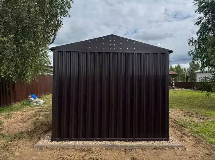 Нами была изготовлена стандартная 5-метровая конструкция с односкатной крышей и торцевой воротной группой в комбинации цветов RAL 1015 «светлая слоновая кость» для основных элементов и шоколадно-коричневого цвета RAL 8017 для фасонных элементов и крыши.
