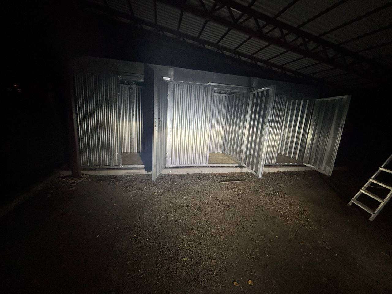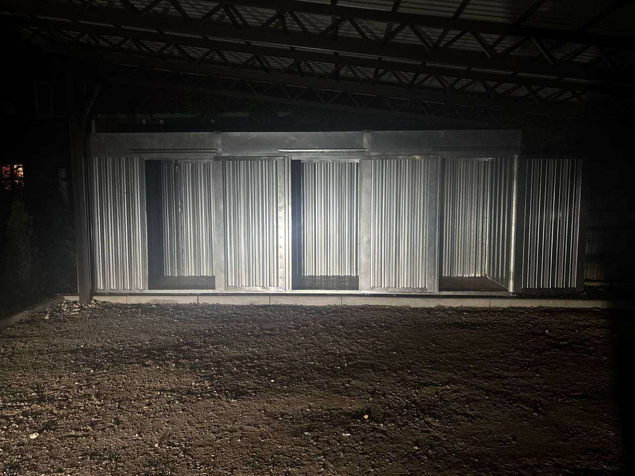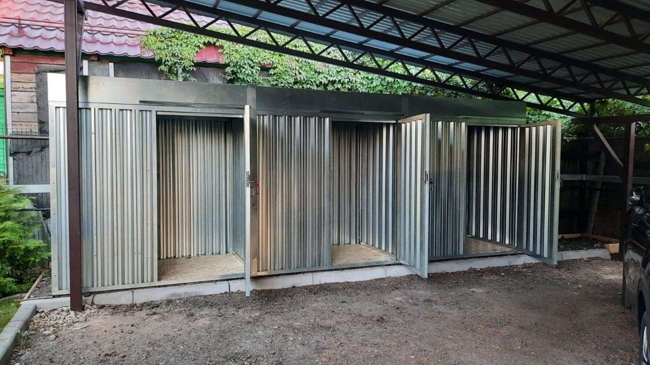 Нами была изготовлена конструкция индивидуальных размеров 6 х 1,3 х 2,3 м с двумя перегородками и тремя входными дверями шириной 1 м по боковой стороне в блестящем цинковом цвете. Каждый отсек постройки получился шириной по 2 метра.