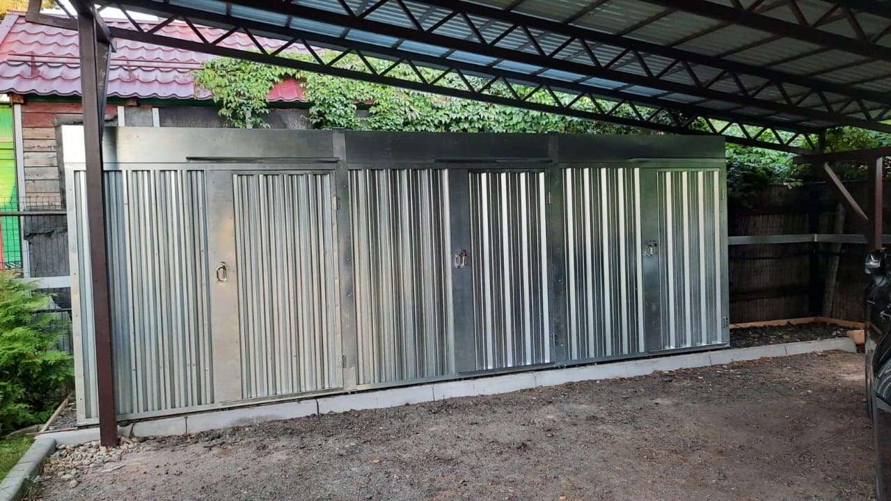 Проект: хозблок индивидуальных размеров с тремя секциями для хранения велосипедов, автомобильных колес и хозяйственных принадлежностей в цинковом цвете.