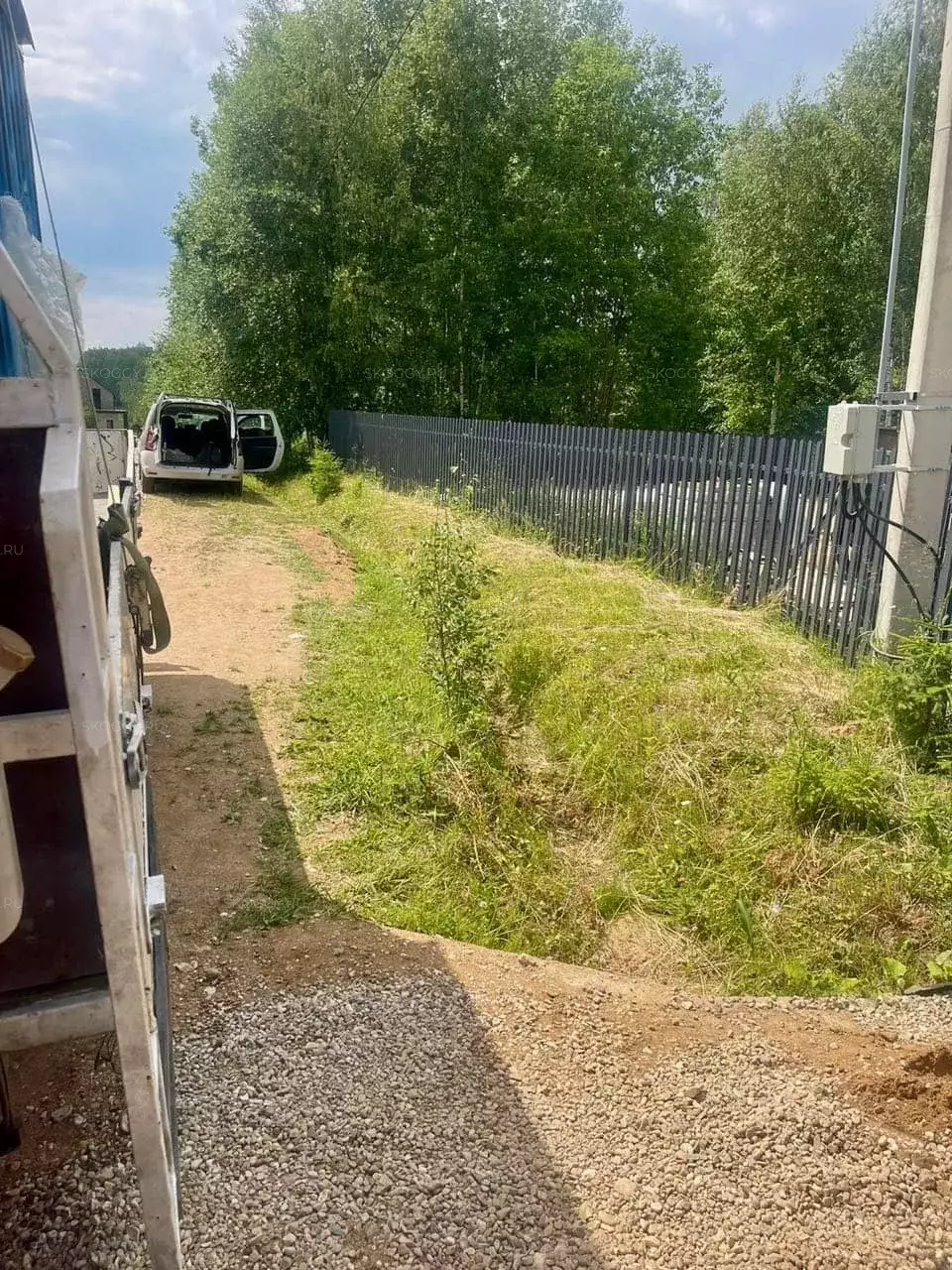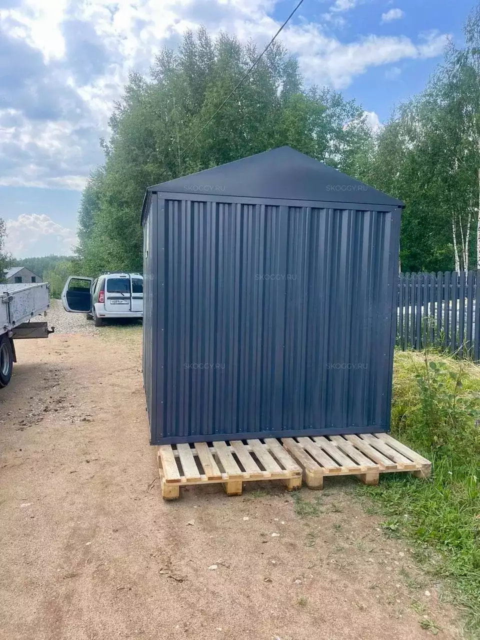 Доставка была согласована на подходящий день, но тут мы столкнулись с проблемой при погрузке. Там, где были въездные ворота, была положена плитка, и манипулятор не смог заехать. Со стороны дороги большое расстояние до забора и ров. Пришлось оставить хозблок возле дома. На участок постройку заказчик переносил своими силами.