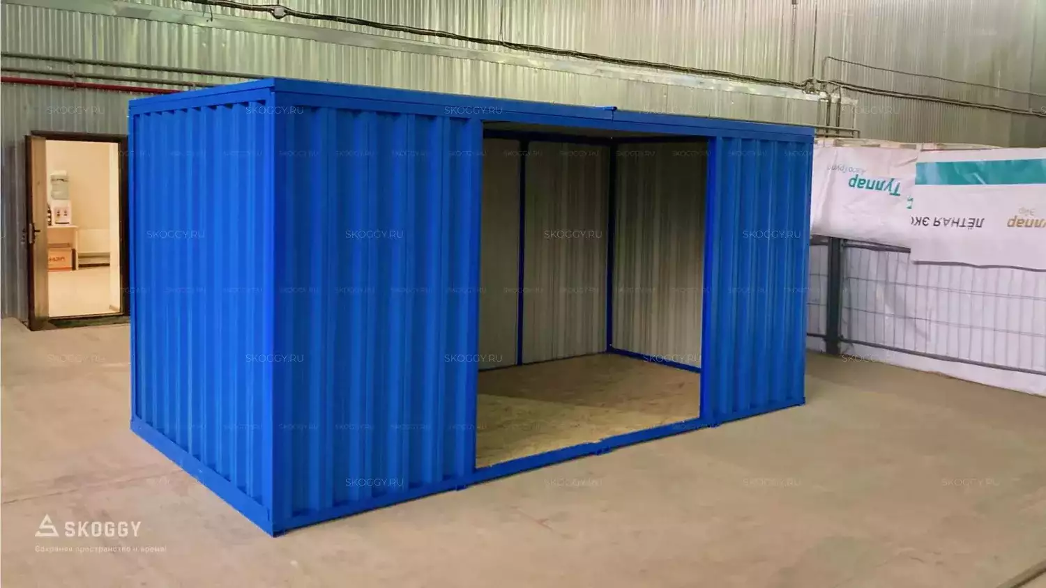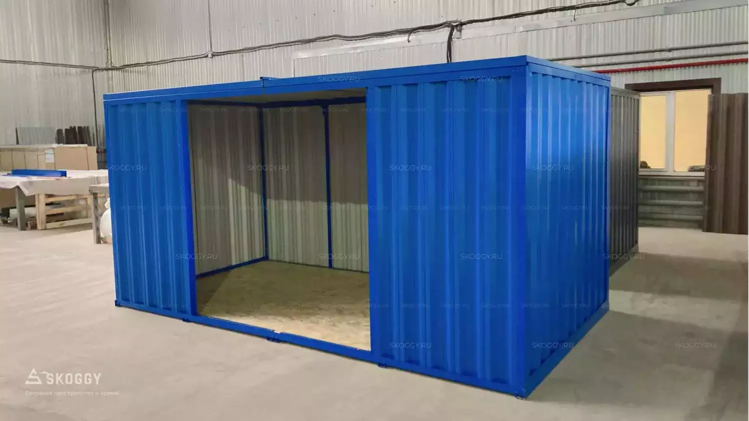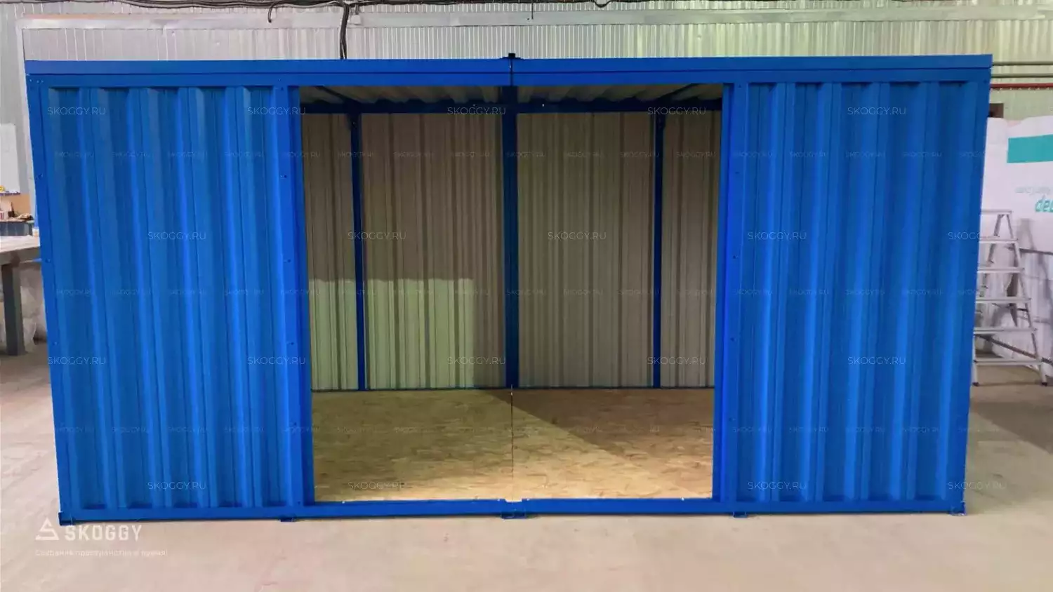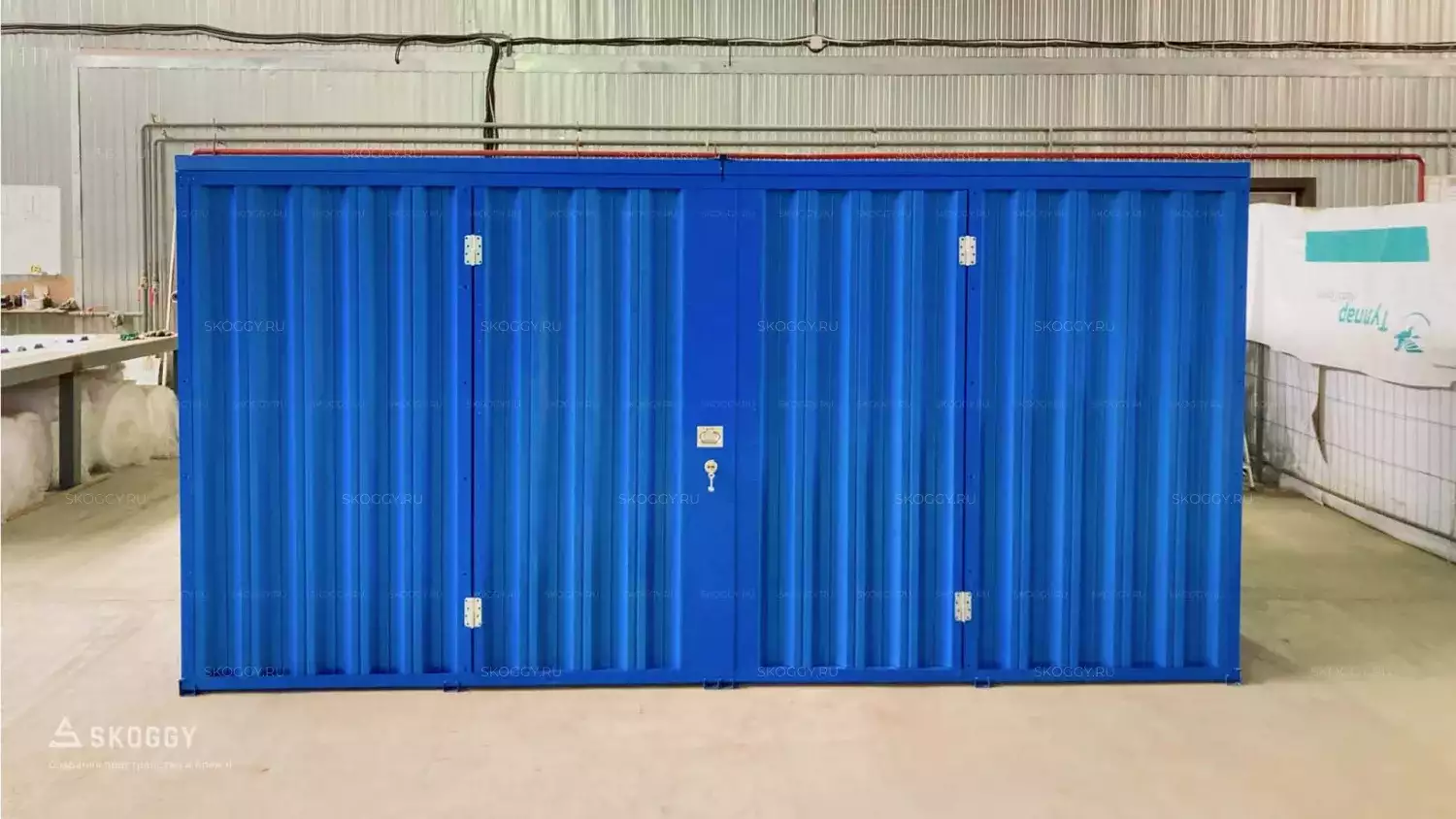 В нашу компанию SKOGGY обратился клиент с просьбой изготовить мобильный хозяйственный блок. После общения с заказчиком мы выяснили, что он собирается использовать его для хранения садового инвентаря, инструментов, стройматериалов и т.д. В планах клиента было установить конструкцию одной стороной к дому, поэтому мы предложили ему блок-контейнер с боковой дверью. Заказчик не захотел стандартный цвет, поэтому выбрал сигнальный синий из палитры RAL.