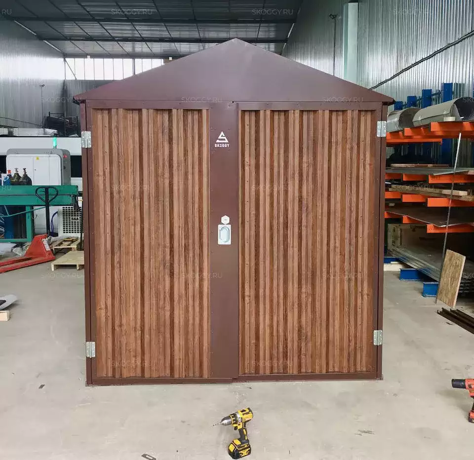 А история звездного взлета начиналась так: к нам обратился заказчик с задачей хранения мототехники. Была выбрана стандартная конструкция длиной 3 метра с двускатной крышей. Покупатель успел воспользоваться нашей акцией «Нанесение принта «под дерево» по цене окраски в цвет RAL».