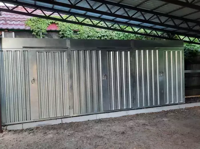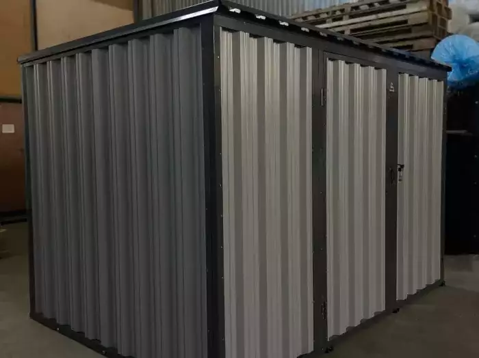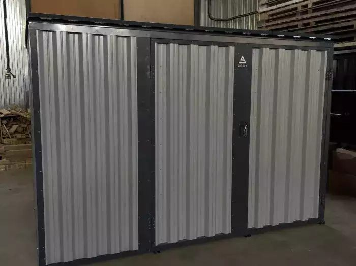 Клиент выбрал оцинкованный хозблок в брутальном цвете RAL 7016 Антрацитово-серый. Выглядит очень эффектно, так еще и дополнительно защищает поверхность контейнера от внешних воздействий. Несмотря на компактный размер - 3 метра - хозблок очень вместительный, в нем можно хранить даже мопед или пару велосипедов, не говоря уже о бытовом инвентаре.