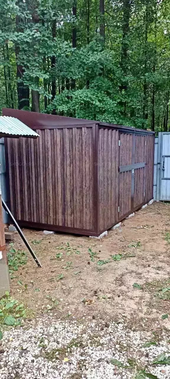 В результате переговоров пришли к следующему: 4-метровый блок-контейнер с односкатной крышей и боковым входом. Так как вокруг загородного участка клиента расположен лес, мы предложили ему сделать дизайн в лесной тематике. Мы показали наш выставочный экземпляр, Глебу Вячеславовичу он понравился, но попросил оттенок потемнее. Остановились на оттенке Наив Марун.