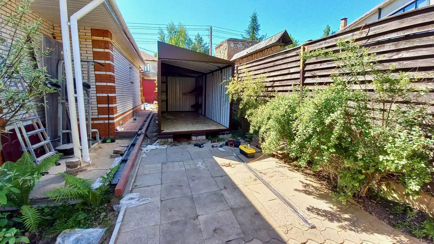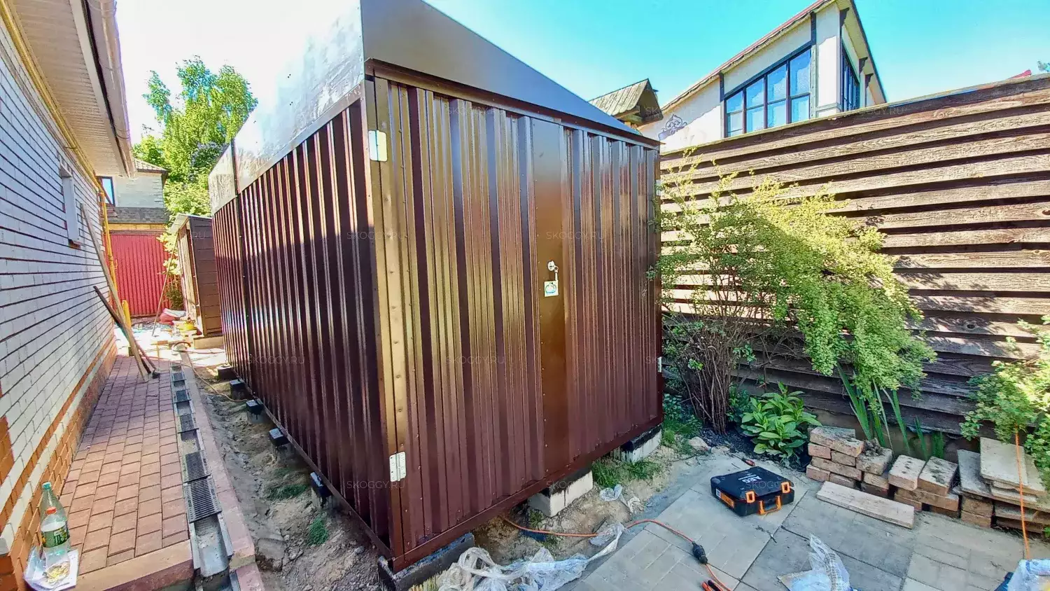 Один из самых частых запросов от наших клиентов - это мини-сарай для участка для хранения садового инструмента. Вот и Владимир обратился к нам именно с такой целью. Мы сразу предложили ему решение - 5-метровый блок-контейнер. Места много не занимает и идеален для хранения.