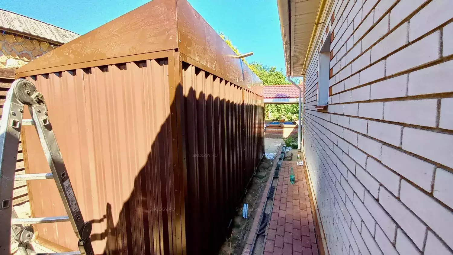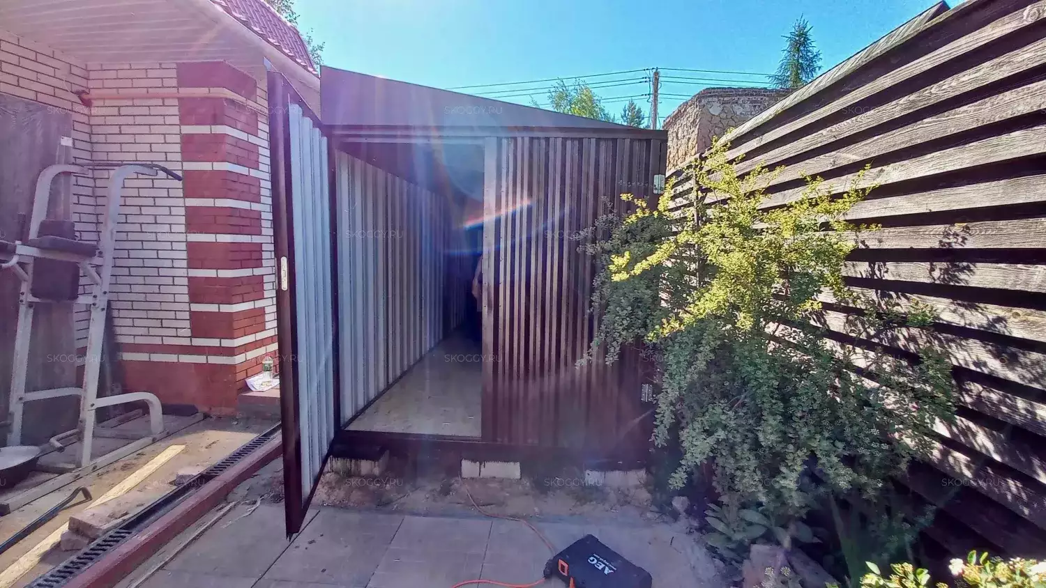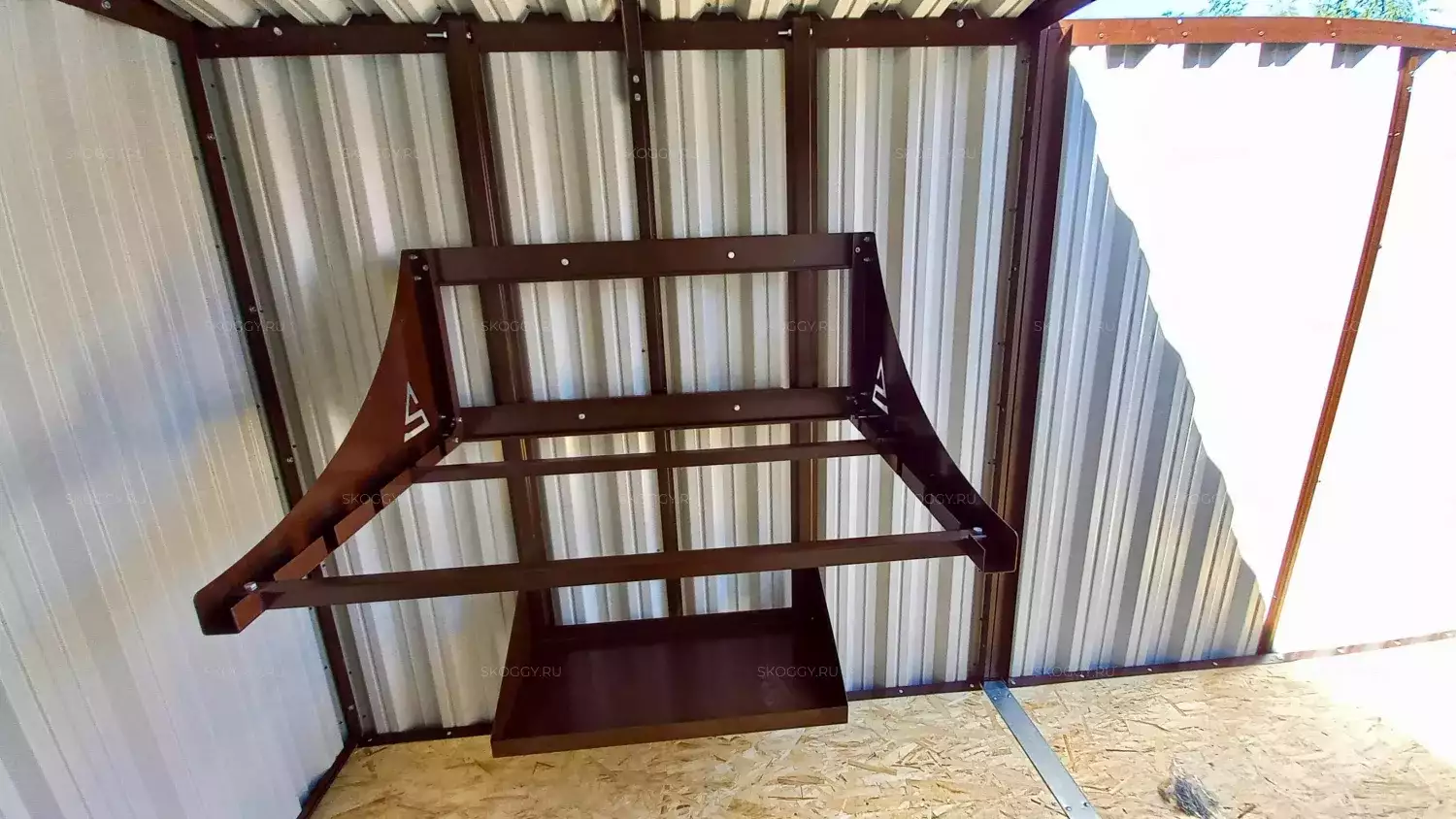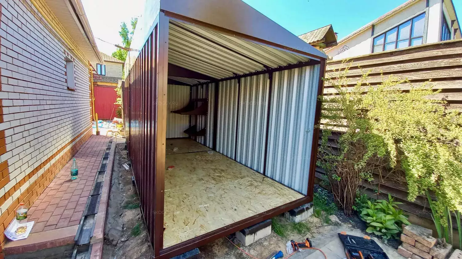 Так как Владимир планировал поставить контейнер одной стороной к дому, мы предложили ему односкатную крышу. Благодаря этому сарай выглядит как пристройка и удобен в использовании. Цвет был выбран из предложенной палитры. Остановился на оттенке RAL 8017 шоколадно-коричневый, так как он подходит к цвету крыши.