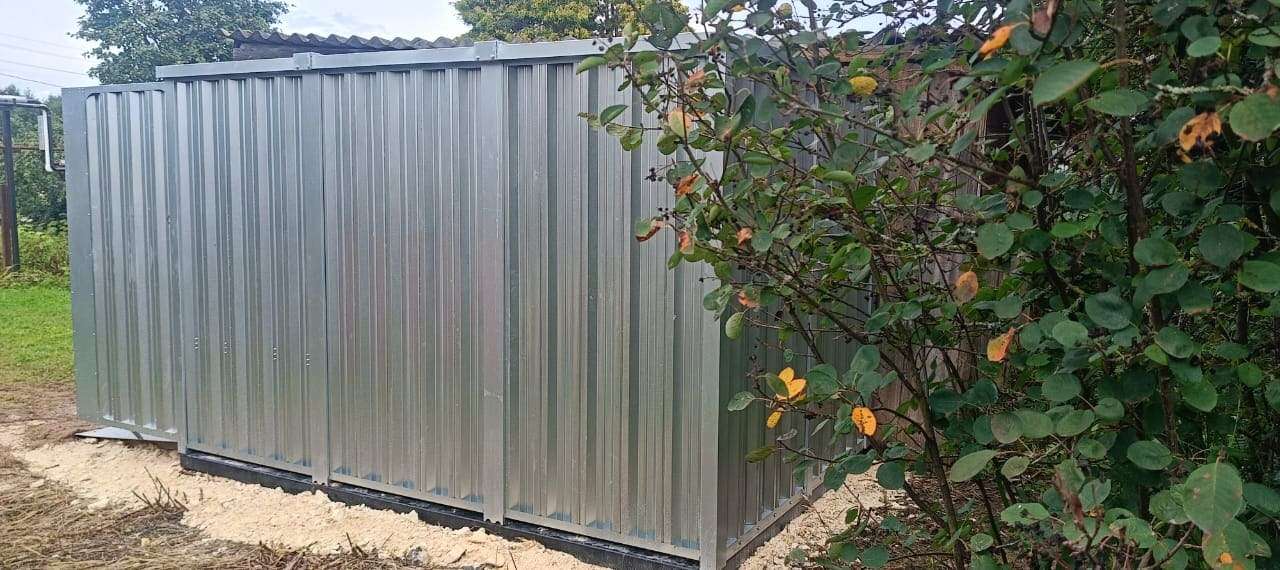 Нами была изготовлена 3-метровая секционная конструкция с плоской крышей и торцевой воротной группой в блестящем цинковом цвете.