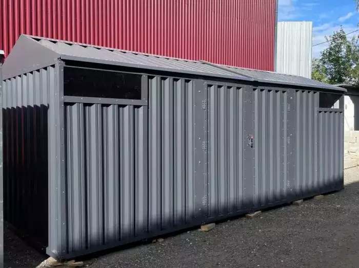Нами была изготовлена 4-метровая секционная конструкция с плоской крышей и торцевой воротной группой в блестящем цинковом цвете.