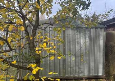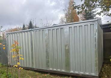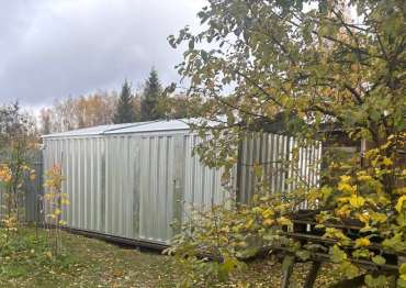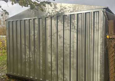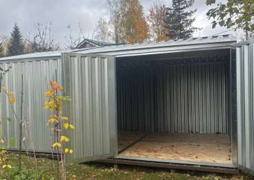 Нами была изготовлена нестандартная конструкция размером 5 х 3,5 х 2,4 м с двускатной крышей и боковой воротной группой в блестящем цинковом цвете.