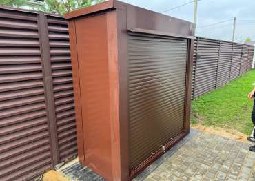Нами была изготовлена конструкция уличного всепогодного шкафа размером 2,03 х 2,022 х 0,88 м с рольставнями в популярнейшем шоколадно-коричневом цвете RAL 8017.