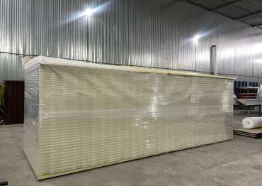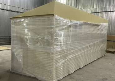 Нами была изготовлена стандартная 6-метровая конструкция с односкатной крышей и двумя входными группами в светлом бежевом цвете RAL 1014.