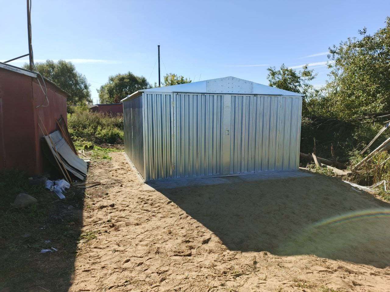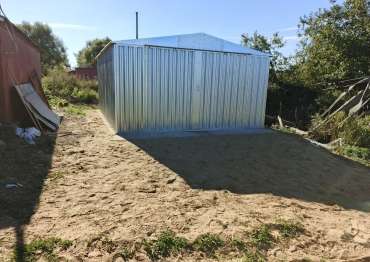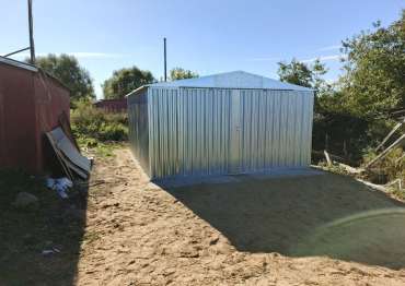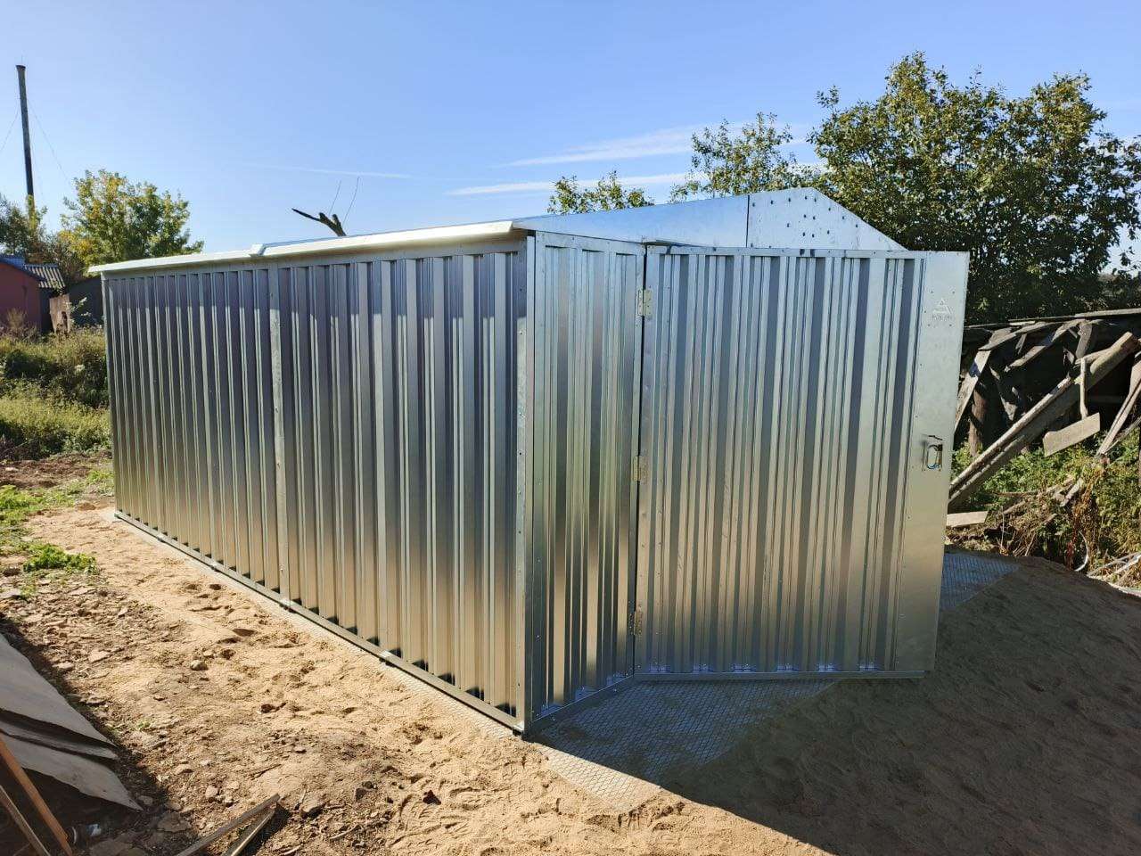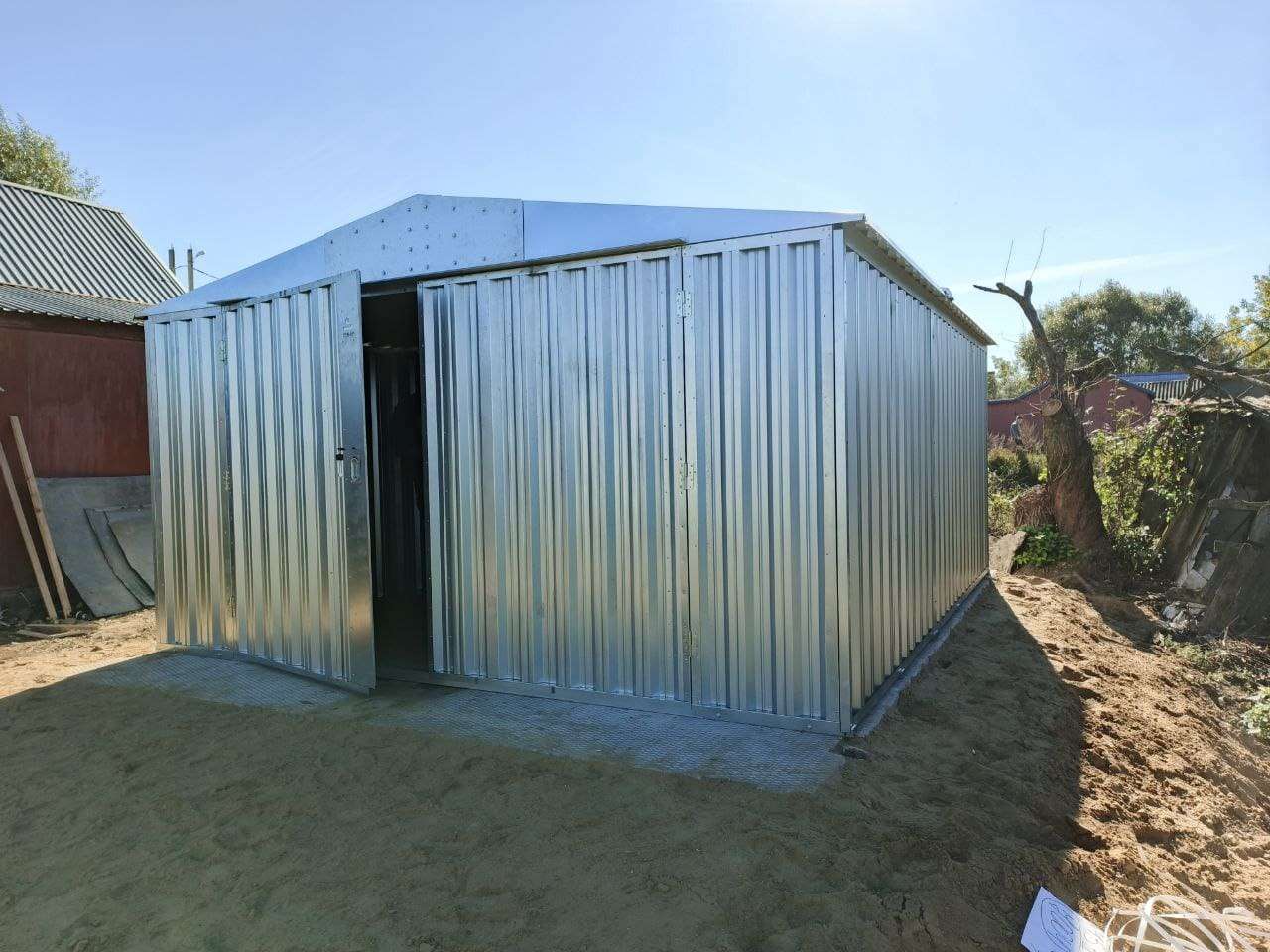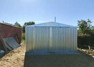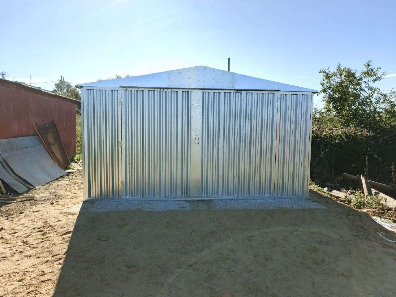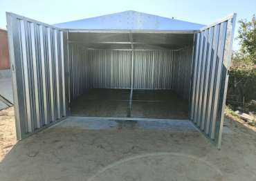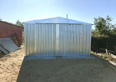 Нами была изготовлена широкая 5-метровая конструкция с двускатной крышей и торцевой воротной группой в блестящем цинковом цвете.