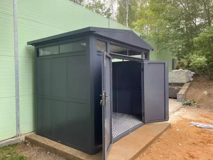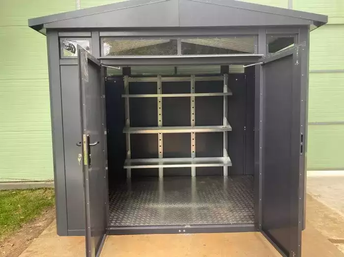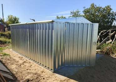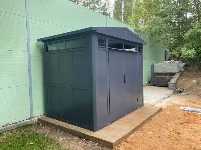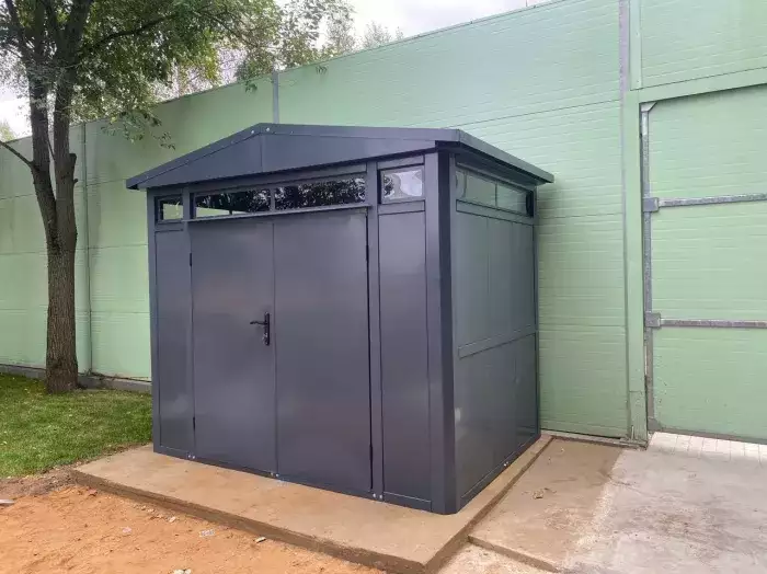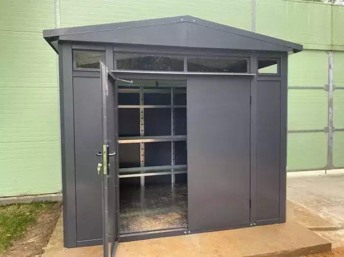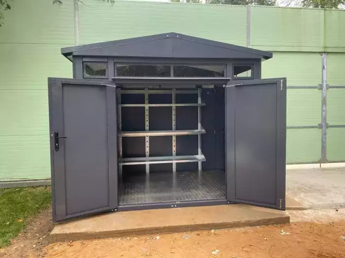 Проект: 5-метровый широкий хозблок для хранения хозяйственных принадлежностей в цинковом цвете.