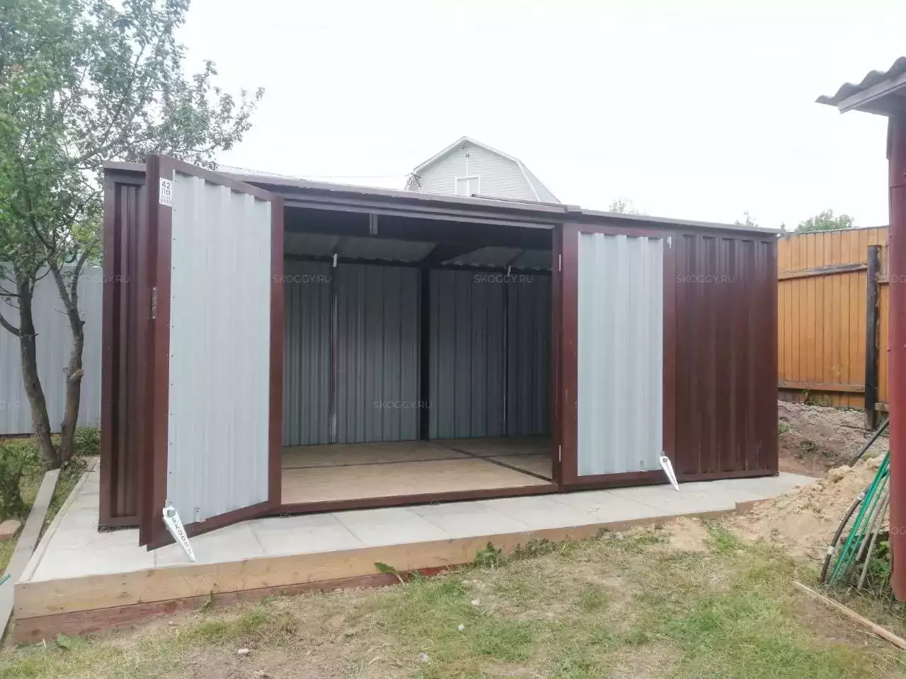 Нами была изготовлена конструкция размером 5 х 3 м с двускатной крышей и боковой воротной группой в популярнейшем шоколадно-коричневом цвете RAL 8017.
