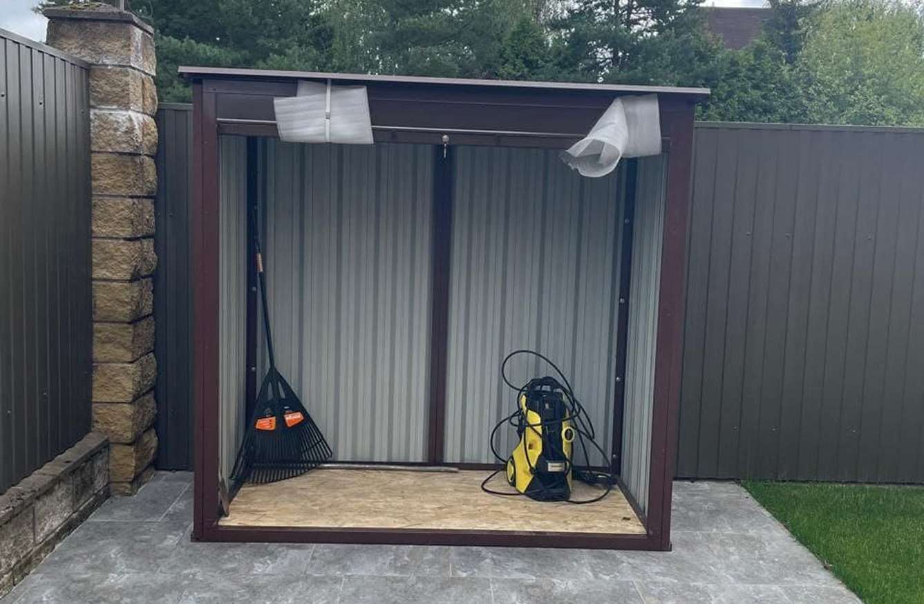 Проект: 6-метровый хозблок для хранения садовой техники и инвентаря в шоколадно-коричневом цвете.
