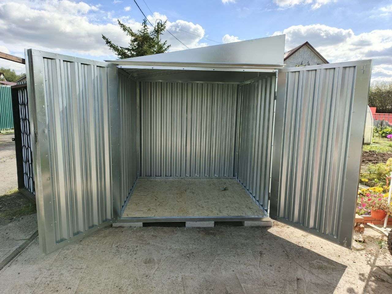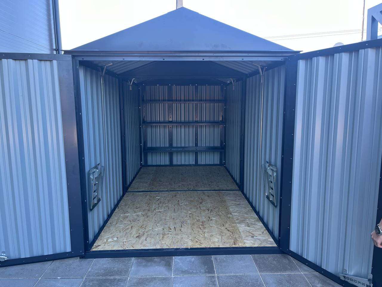Проект: 4-метровый хозблок для хранения садовой техники в цинковом цвете.