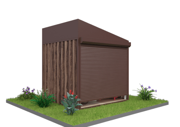 Проект: дровница с рольставнями для хранения садового инвентаря в шоколадно-коричневом цвете.